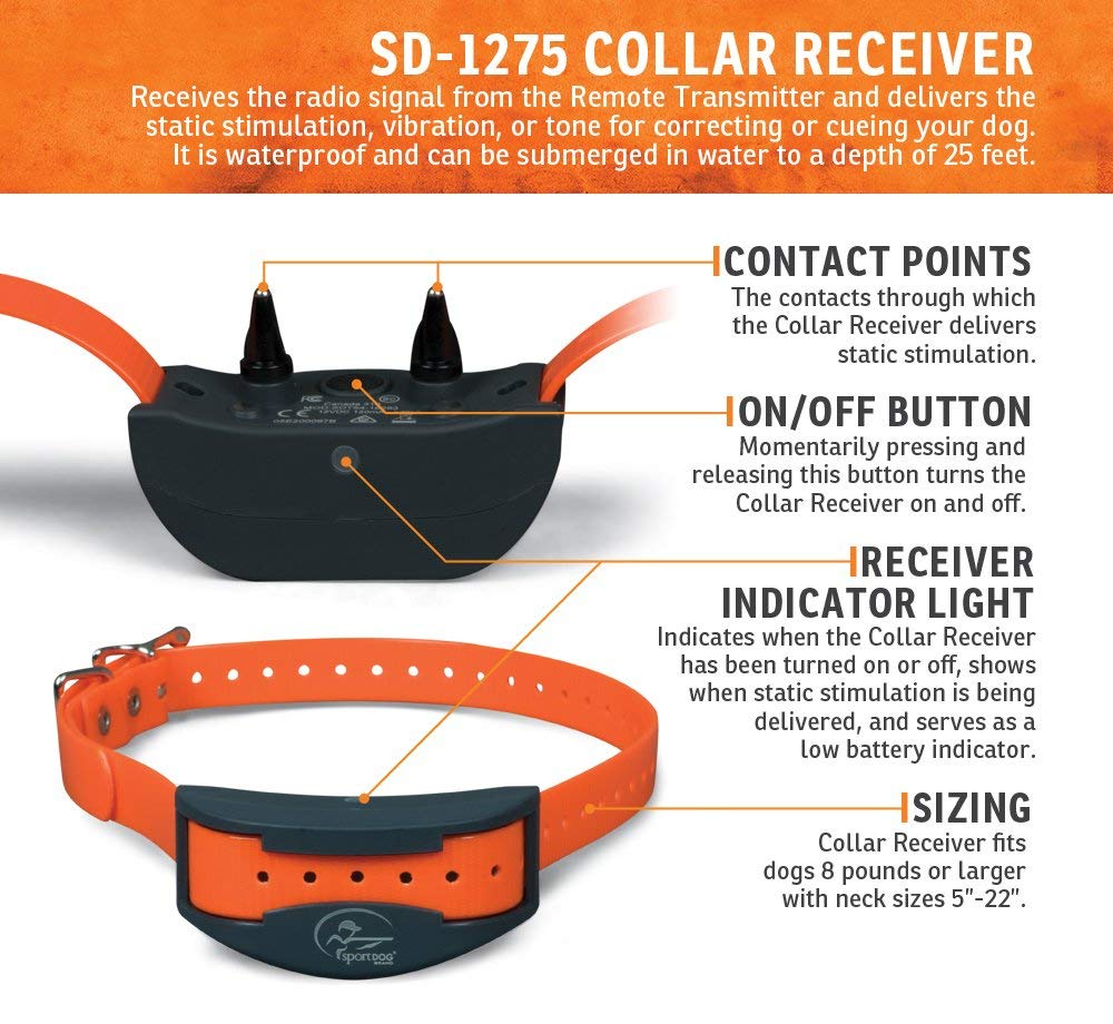 The SportTrainer 1275 gives you long distance control of your dog and features an easy-to-read, bright OLED screen that clearly displays the selected dog, static stimulation level and mode, and battery status. Large plus/minus buttons make toggling among dogs and changing stimulation levels a breeze, making the SD-1275 especially suited for multi-dog training.
